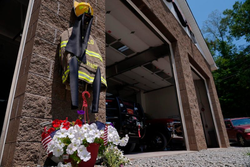 Flowers and a tribute to fallen firefighter Corey Comperatore are pictured at the Buffalo Township Volunteer Fire Company in Buffalo Township, Pa., Monday, July 15, 2024. Comperatore was shot and killed at the Trump rally in Butler, Pa., Saturday, July 13, 2024. (AP Photo/Sue Ogrocki)