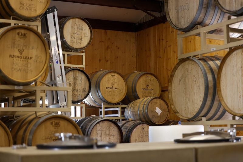 Barrels of wine and spirits are seen at a Flying Leap Vineyards & Distillery warehouse in Elgin, Arizona, on April 2, 2025. (Photo by Alexis Heichman/Cronkite News)