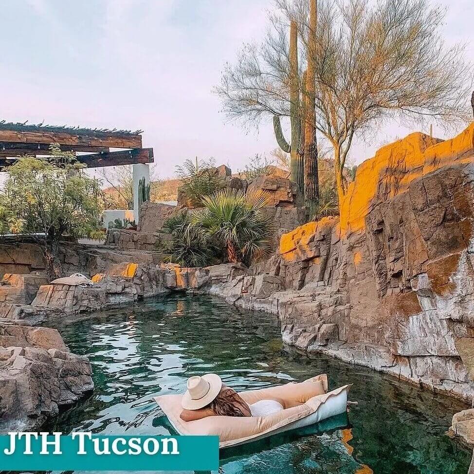 Nestled in the Sonoran Desert near Saguaro National Park lies JTH Tucson. Their canyon pool’s modern comfort is disguised in beautiful rocky formations that match the surrounding wilderness, giving pool-goers the feeling of being completely immersed in nature.