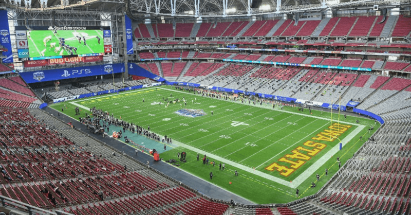 Iowa State, in black, beat Oregon 34-17 in last years Fiesta Bowl before a largely empty stadium because of COVID-19 safety protocols. Organizers expect big crowds for this years’ game between No. 5 Notre Dame and No. 9 Oklahma State. (Photo courtesy the Fiesta Bowl)