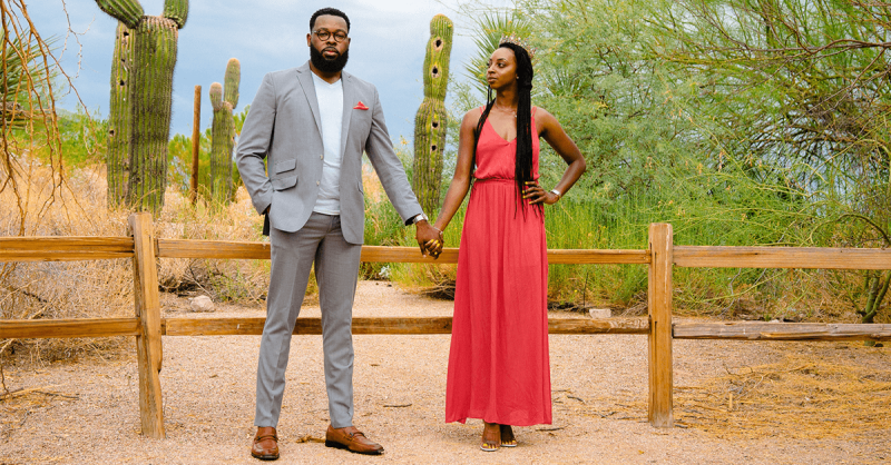 man wearing suit and woman in red dress holding hands in front of desert plants