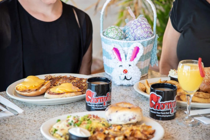 If you’d prefer to celebrate Easter at home, the Valley’s New York deli Chompie’s is serving brunch to go. The Valley chain is offering an Easter Brunch that serves four for $79.99 and The Feast that serves eight for $144.99. The packages include hearty Easter fare like scrambled eggs, bacon slices, ham steak slices, home fries, bagels, cream cheese, fruit salad, and muffin loaf. Additions like the Nova Lox Package including tomato and red onion are available for an extra charge.