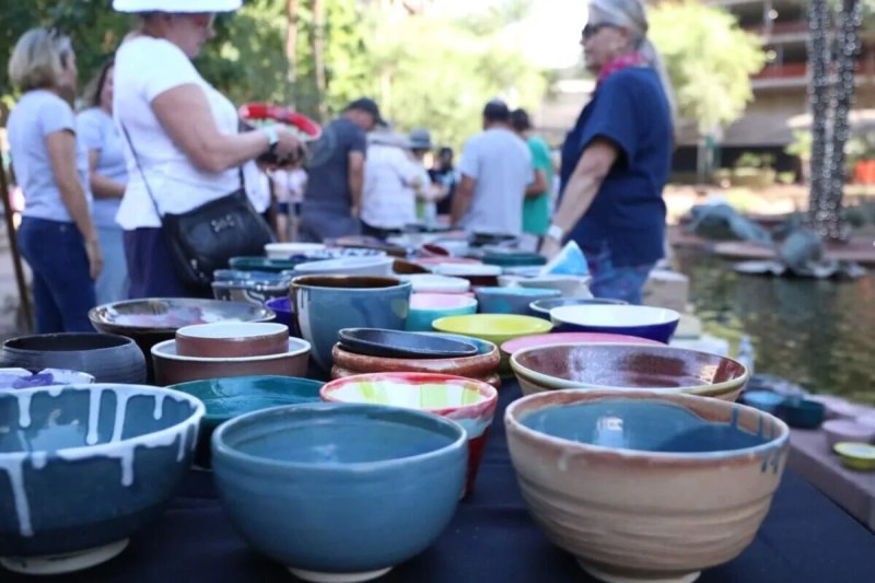 The Arizona Clay Association made and donated the 1,200 bowls sold this year. They came from such events as the Bowl-a-Thon at Sunshine Sunflower Studio in central Phoenix, public announcements calling for donations and gifts from partners, including the Phoenix Center for the Arts and Shemer Art Center.
