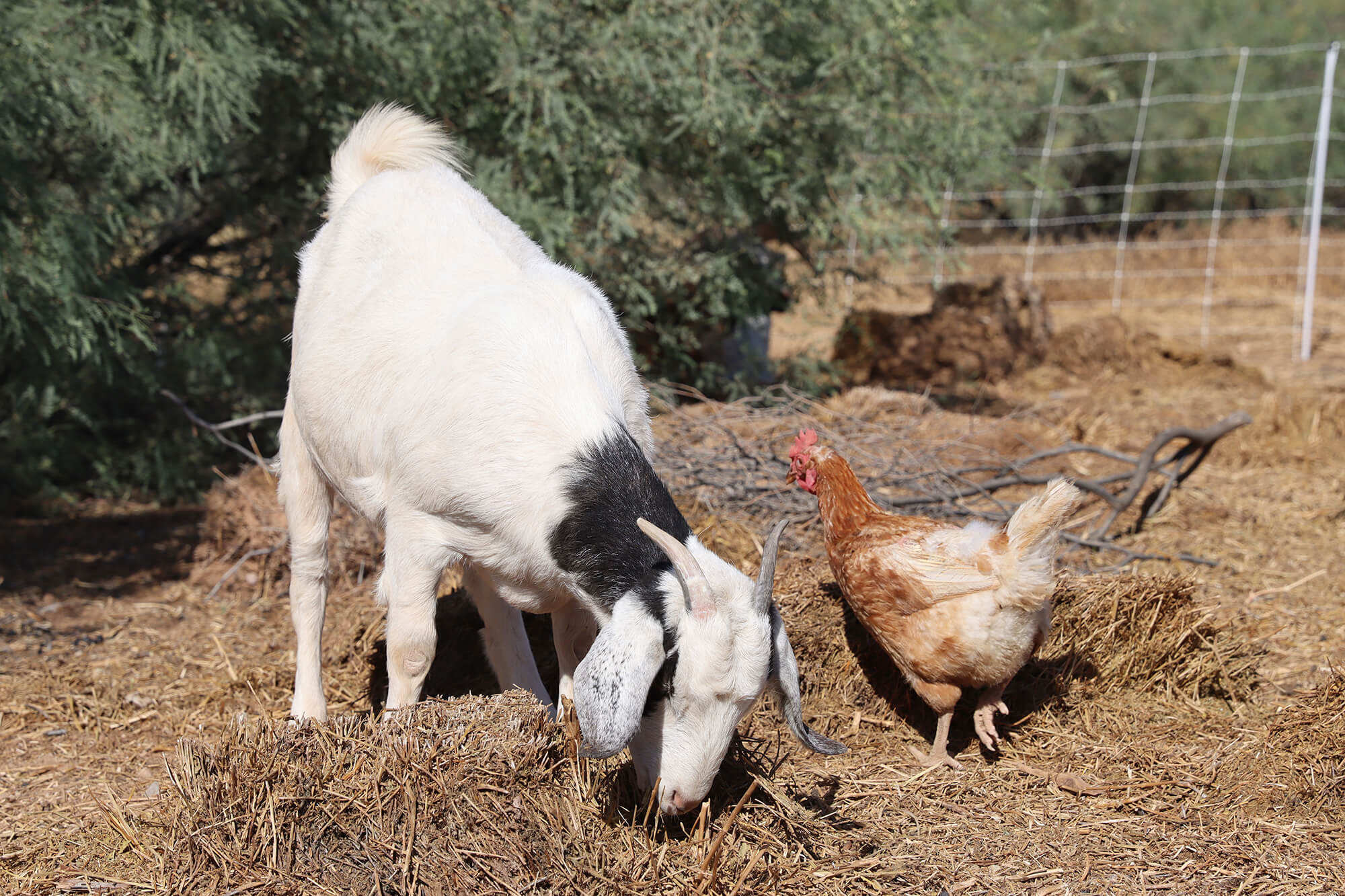 A goat and chicken graze within a designated section of desertified land. The animals break up the hard dirt with their feet, which allows for new and healthy plants to grow after the animals are moved. (Photo by Brock Blasdell/Cronkite News)