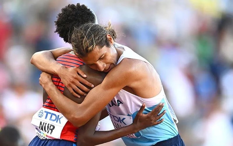 EUGENE, Ore. – Even though exhaustion had set in, former Northern Arizona teammates Abdihamid Nur and Luis Grijalva prioritized a tight embrace after the men’s 5,000-meter final Sunday at the World Athletics Championships.