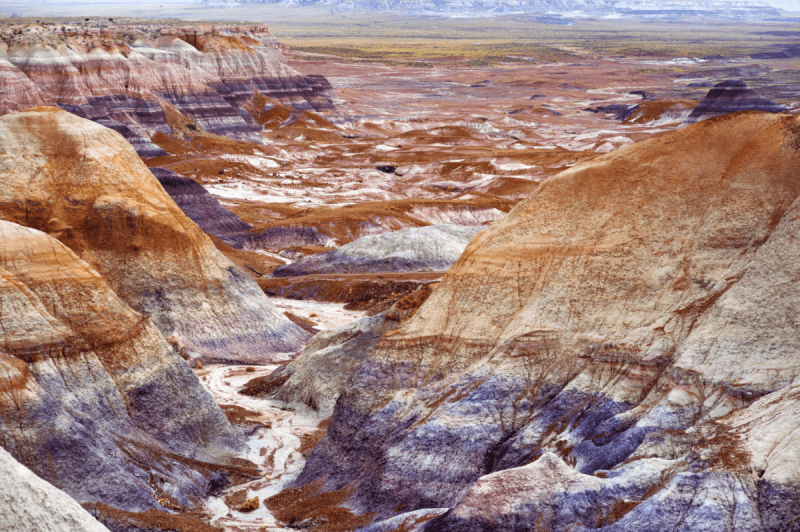 Arizona’s Petrified Forest National Park is home to the Navajo Nation. While the park contains petrified forests, where the trees have turned to stone, perhaps its most stunning images are from the colorful badlands, rock striped with colors. Historic Route 66 used to run through a portion of the park. It’s not in use anymore, but geocaching fans can search for telephone poles and other remnants of the old highway.