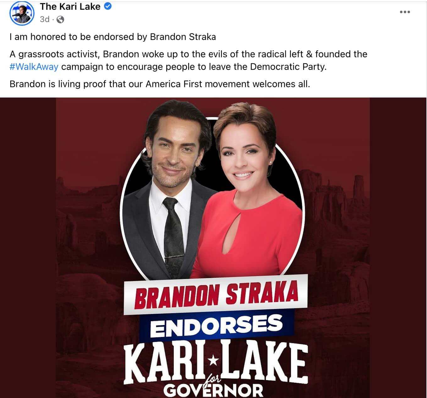 “I am honored to be endorsed by Brandon Straka,” Lake announced on Facebook last month. “A grassroots activist, Brandon woke up to the evils of the radical left and founded the #WalkAway campaign to encourage people to leave the Democratic Party. Brandon is living proof that our America First movement welcomes all.”