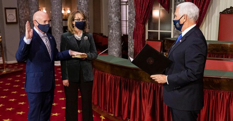 Kelly was sworn into office by Vice President Mike Pence, and both men wore masks and bumped arms in congratulations when the oath was over. Among those watching from the visitors’ gallery were his wife, former Rep. Gabby Giffords, D-Ariz., and Scott Kelly, his twin brother and fellow retired astronaut.