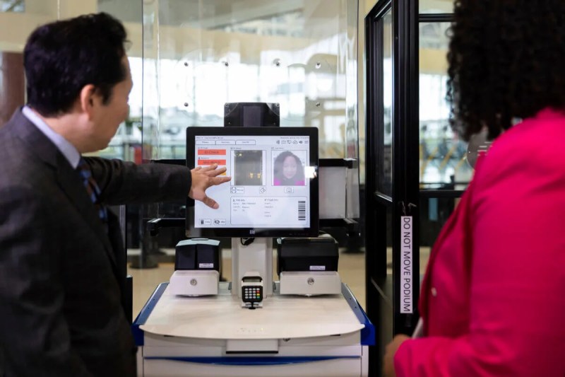 A passenger walks up to an airport security checkpoint, slips an ID card into a slot and looks into a camera atop a small screen. The screen flashes “Photo Complete” and the person walks through — all without having to hand over their identification to the TSA officer sitting behind the screen.