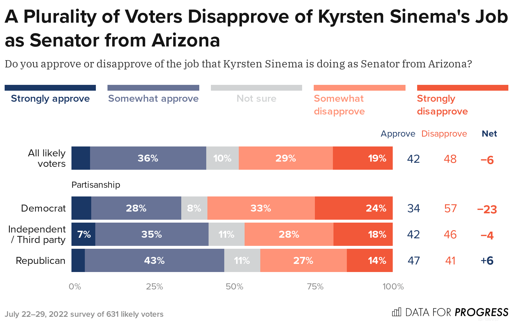 Methodology: From July 22 to 29, 2022, Data for Progress conducted a survey of 631 likely voters in Arizona using web panel respondents. The sample was weighted to be representative of likely voters by age, gender, education, race, and voting history. The survey was conducted in English. The margin of error is ±4 percentage points. N=631 unless otherwise specified. Some values may not add up to 100 due to rounding.
