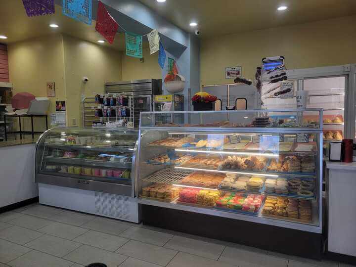 At the front of the store are coolers filled with slices of vanilla, chocolate, and flan cakes. Beside them is a glass case of pastries the size of my head, some jelly-filled and powder-covered cookies, and large loaves of sweet bread. The selection extends in the wooden case filled with even more baked goods like large cochito, pink-powdered covered croissants, and a multitude of empanadas ranging from limon and apple to pumpkin and lemon. And be sure to ask the bakery staff about to-go boxes or their bags of bread.