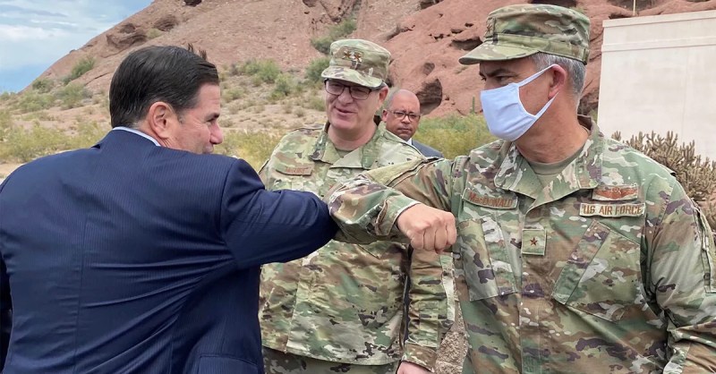 Arizona’s governor encourages the public to wear protective masks in public but is rarely seen following his own advice.