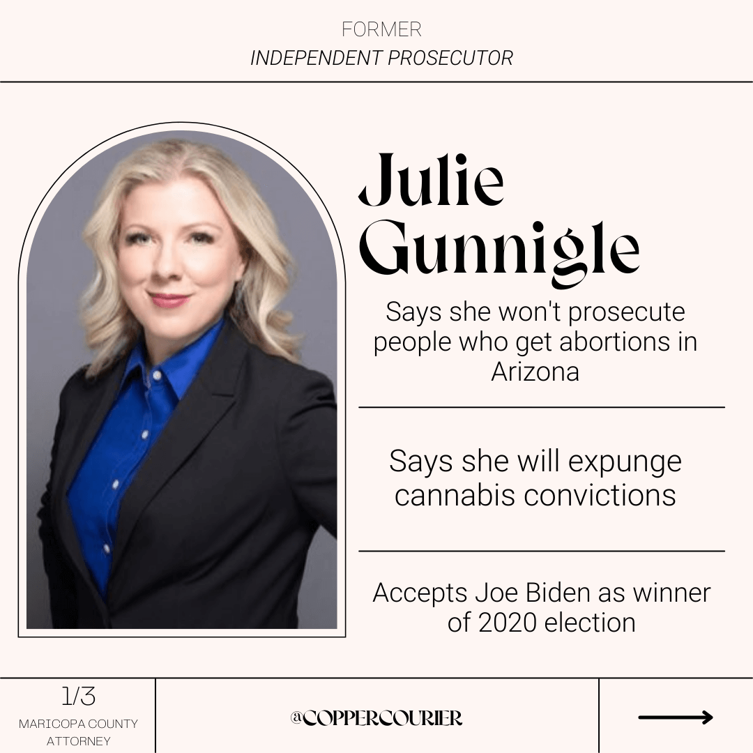 Gunnigle worked as a prosecutor in Illinois and Indiana as well as a private practice attorney. She lost to former Maricopa County Attorney Allister Adel in 2020 by roughly 38,000 votes.