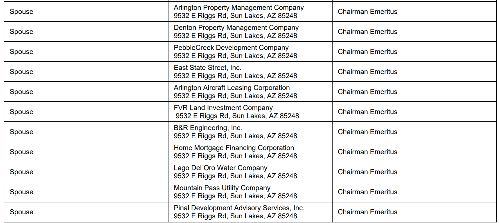 - chaired 23 other companies—including several utility, water, construction, and development companies—all of which are registered at the same address in Sun Lakes.